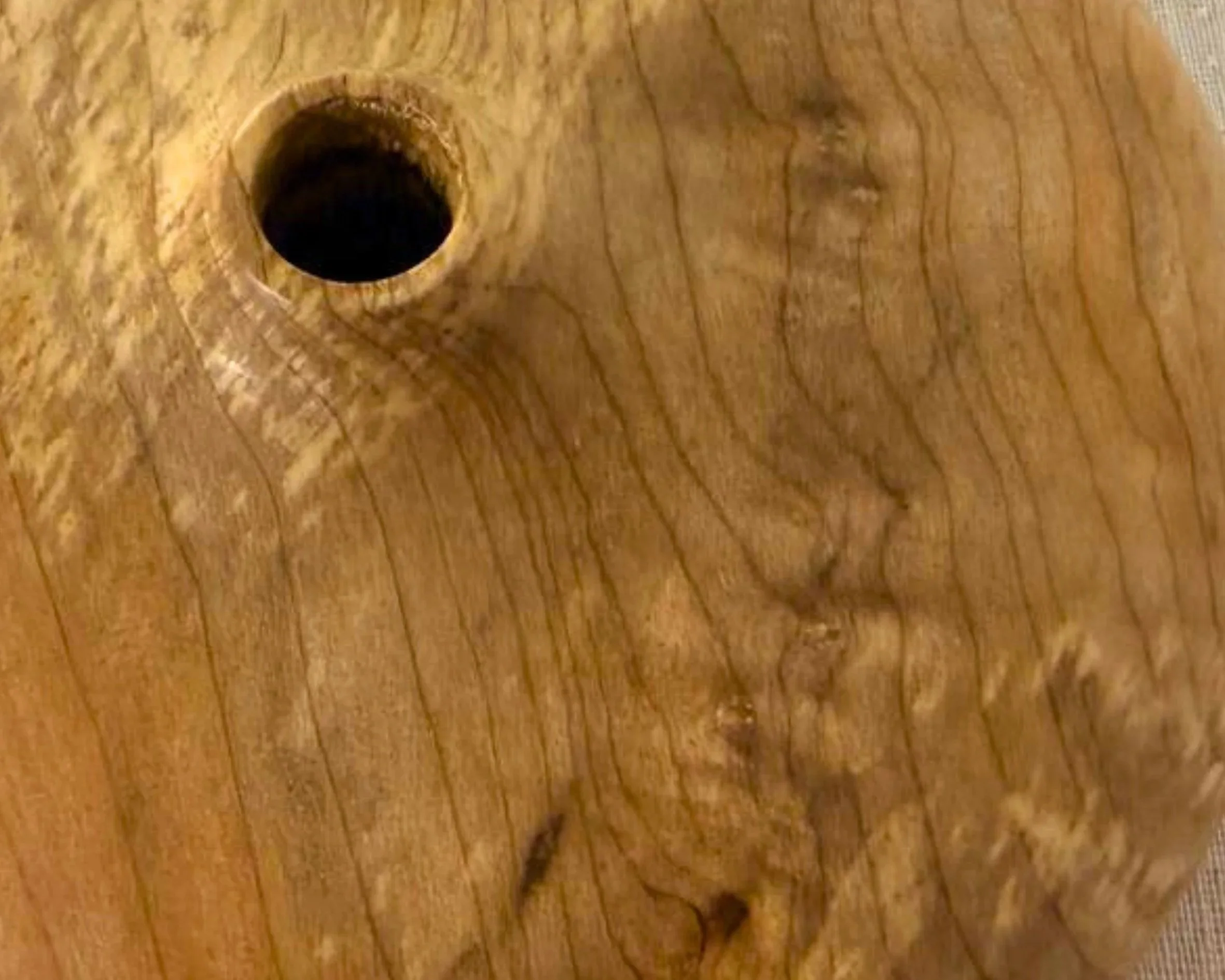 A figured maple closed form with a low, quiet profile and a single intentional opening at the top. The form reads as calm and modern, while the figuring brings subtle movement across the surface, shifting as the light changes and as you move around it.