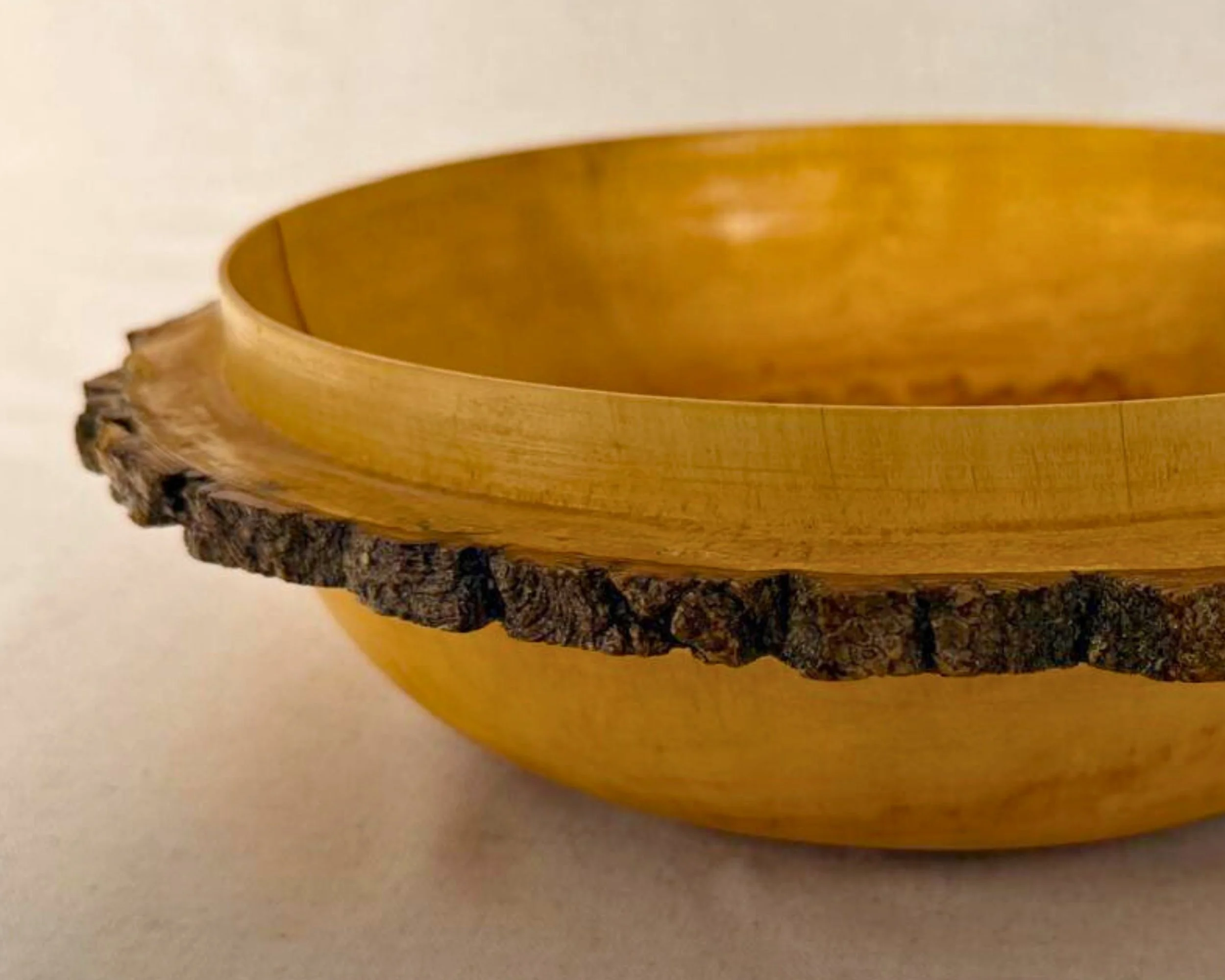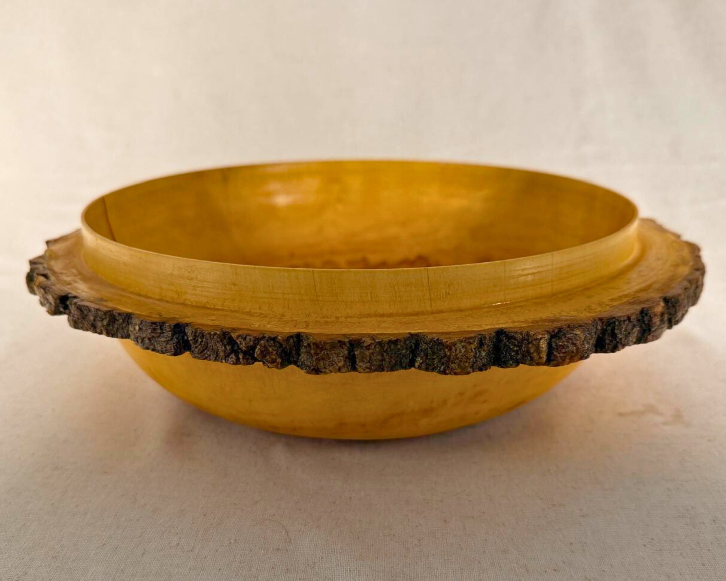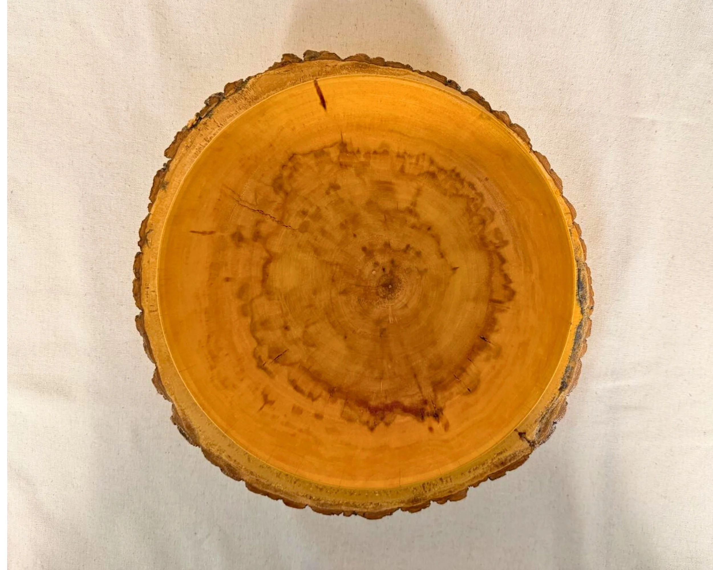 This is a one-of-a-kind tabletop object, turned to preserve the character that made the wood worth saving in the first place: the uneven outer contour, the tonal shifts from honey to deeper brown, and the quiet movement across the grain that changes as you walk around it.
